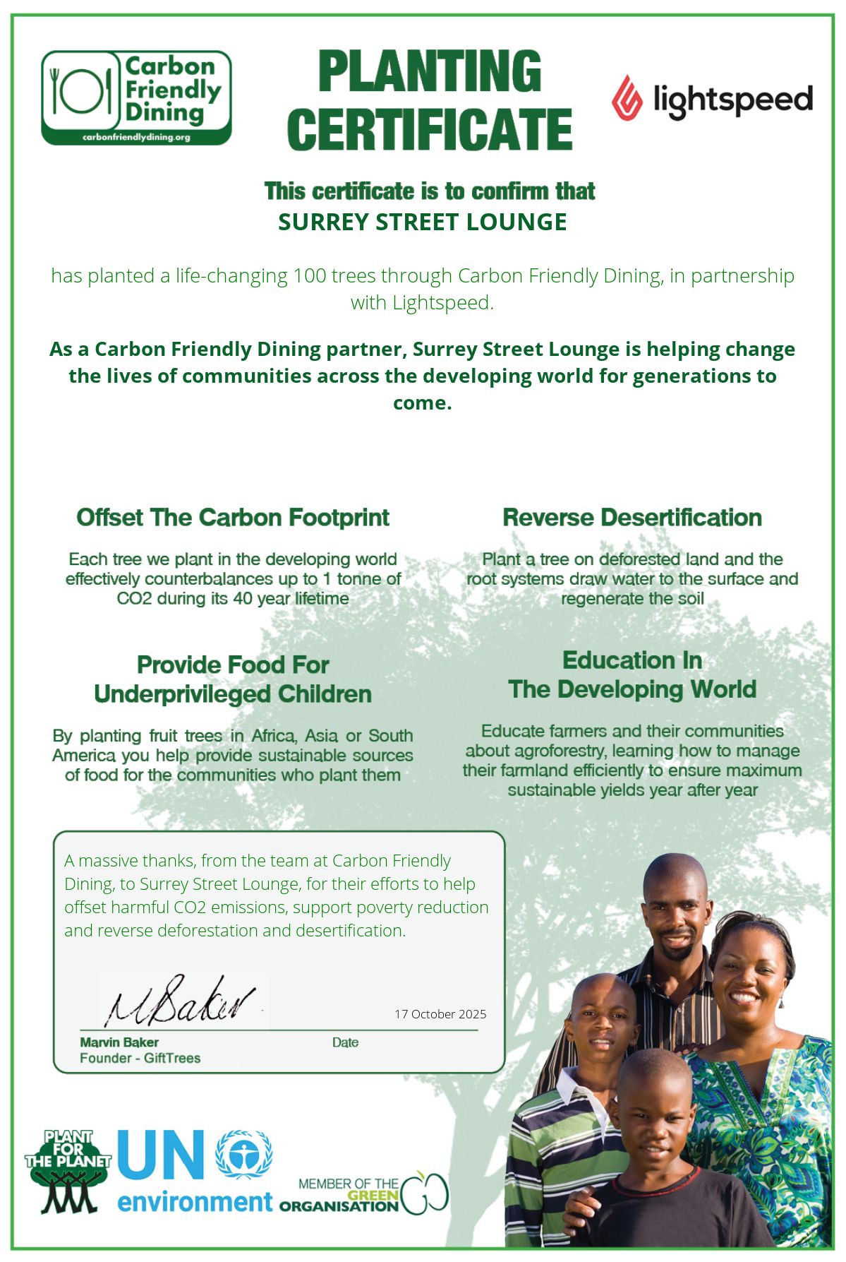 By being a Carbon Free Dining Certified partner, Surrey Street Lounge plants hundreds of trees each month, effectively offsetting the CO2 footprint of the meals it serves.